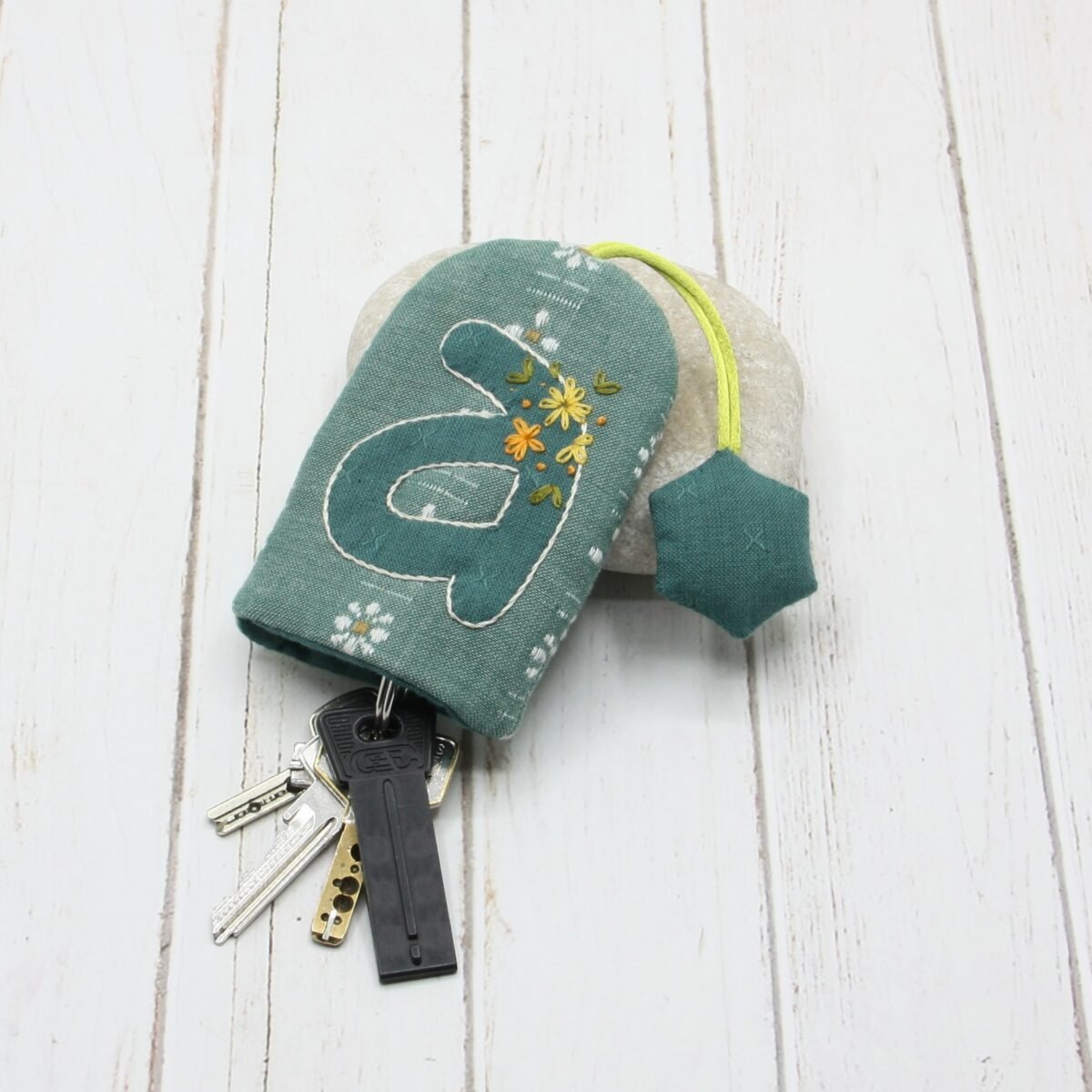 Las piezas que conforman este llavero están aplicadas a mano, al igual que los bordados.