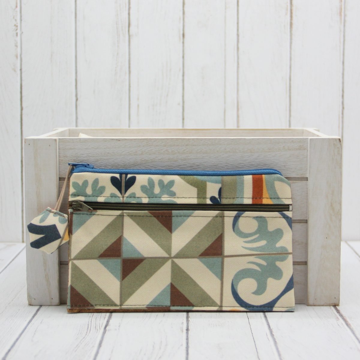 El monedero Suzette está confeccionado con una loneta con estampado de baldosa hidráulica y tela de corcho por detrás. Una combinación preciosa.